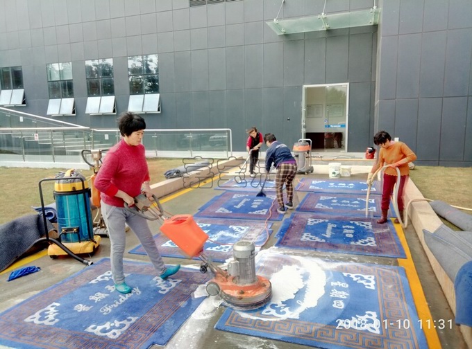 五、施工用具 (1)用2000千瓦的吸塵器除去地毯表面灰塵和細小雜物 (2)用毛刷沾專用去污劑去除地毯上明顯難以處理的污漬 (3)將干泡清洗劑與清水按比例倒入多功能清洗機的水箱,用清洗機開始有順序清洗地面 (4)清洗之后用吸水機吸干多余的水 (5)如急用可用大型吹干機吹干即可珠海清洗地毯 珠海清潔公司