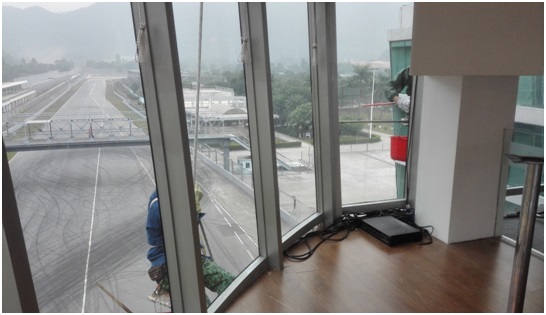 玻璃幕墻:裙樓部分的準備方法同清洗馬賽克外墻,采用的清潔劑、清潔工具為玻璃水、洗潔精、百潔巾、玻璃刮刀等。高處作業(yè)采用吊船清潔,先把自由伸縮的掛臂固定在天臺的女兒墻上,在掛臂的另一端放上平衡鐵,平衡鐵的重量應(yīng)超過于人、吊籃及清潔工具重量的總和。放下牽引鋼絲繩套上吊籃,開啟開關(guān)提升到頂部,工作人員帶上清潔用品上吊籃內(nèi)開始操作,進入吊籃應(yīng)保持吊籃平衡,從上往下有序地清潔。玻璃幕墻每年全面清潔一次,局部污染,即時發(fā)現(xiàn)即時清理,以免日久難以處理干凈。在操作吊籃時一定按照操作規(guī)程運作,以免發(fā)生意外,使用玻璃刮時應(yīng)注意避免金屬部分刮花玻璃表面。復(fù)合鋁板:準備方法同清洗玻璃幕墻,清潔工具為起漬水、百潔布、玻璃刮刀等。清洗方法:用百潔布浸起漬水在復(fù)合鋁板表面上清洗,然后用水沖洗干凈;如有局部嚴重污染或有污垢,應(yīng)加重清潔劑的濃度重點擦洗。復(fù)合鋁板表面清洗每年全面清潔一次,如發(fā)現(xiàn)局部污染,即時清潔。使用玻璃刮時應(yīng)注意避免金屬部分刮花玻璃表面。